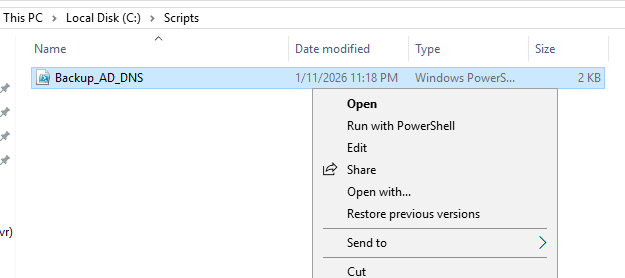 Per començar amb el backup nosaltres hem demanat un script a Gemini per fer l’automatització del backup, ja que és un requisit, per fer l’script a Windows només has d’obrir un bloc de notes (Notepad en anglès), i inserir el script, un cop està només has de desar-ho com un script i deixar-ho llest a la carpeta dels scripts: